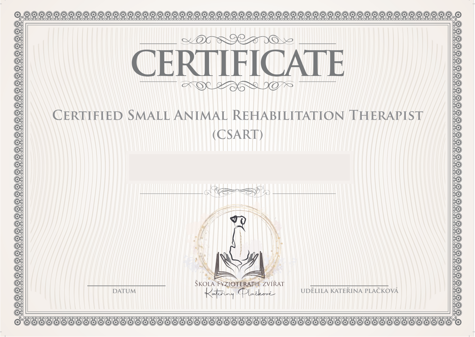 Kromě již zmíněného titulu CSART - Certified Small Animal Rehabilitation Therapist- titul získaný na základě ročního certifikovaného kurzu v rámci Školy fyzioterapie zvířat PhysioDOG Academy, se setkáte také s titulem CertCAAPR - Certified Czech Association Animal Physiotherapy and Rehabilitation- titul získaný na základě ročního certifikovaného kurzu ASOFYREZ